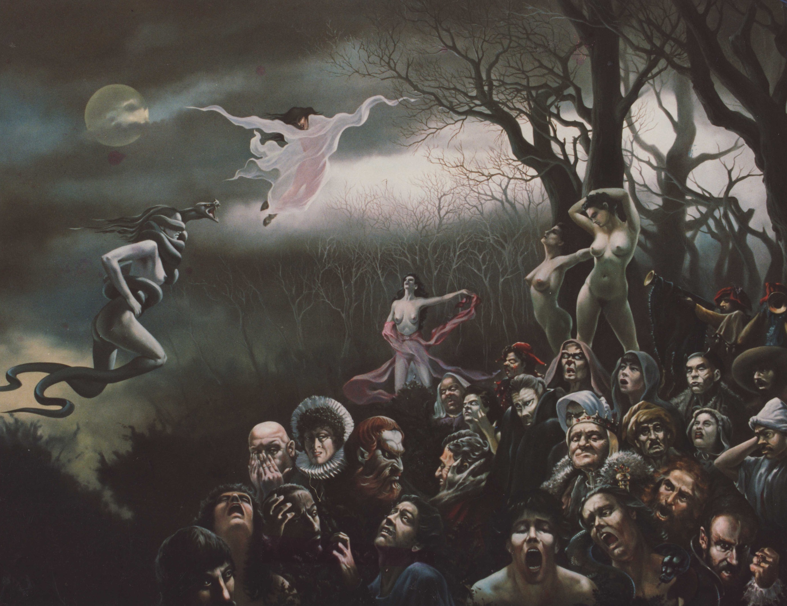 The leader, the snake woman, orchestrates the ceremony alongside a winged demon. On these two domineering figures, broad red lines are applied, which offer equilibrium with the thinner red lines over the lustful women and trees to the right. The vertical axes suggest strong energy and elation, which are frequently present in the paintings of Iannis.